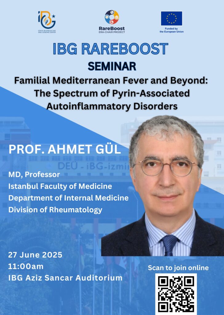 On June 27th at 11:00 am, Prof. Ahmet Gül will give a seminar titled “Familial Mediterranean Fever and Beyond: The Spectrum of Pyrin-Associated Autoinflammatory Disorders” at IBG Aziz Sancar Auditorium.