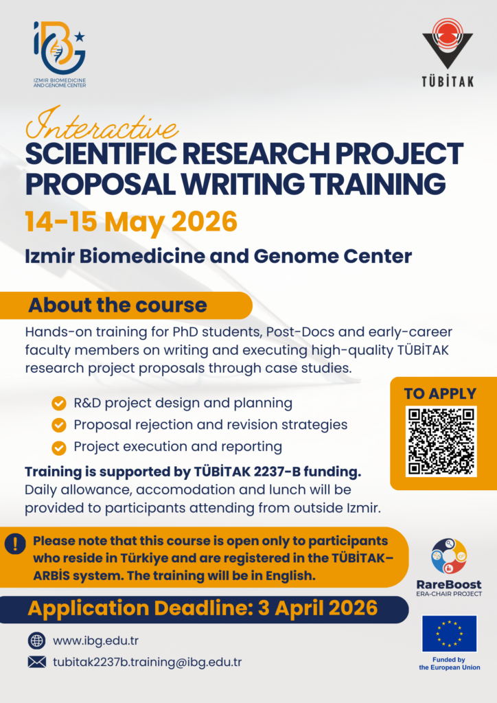 TÜBİTAK 2237-B programı kapsamında desteklenen “Etkileşimli Bilimsel Araştırma Proje Önerisi Yazma Eğitimi”, 14-15 Mayıs 2026 tarihlerinde İzmir Biyotıp ve Genom Merkezi’nde (İzmir, Türkiye) gerçekleştirilecektir.